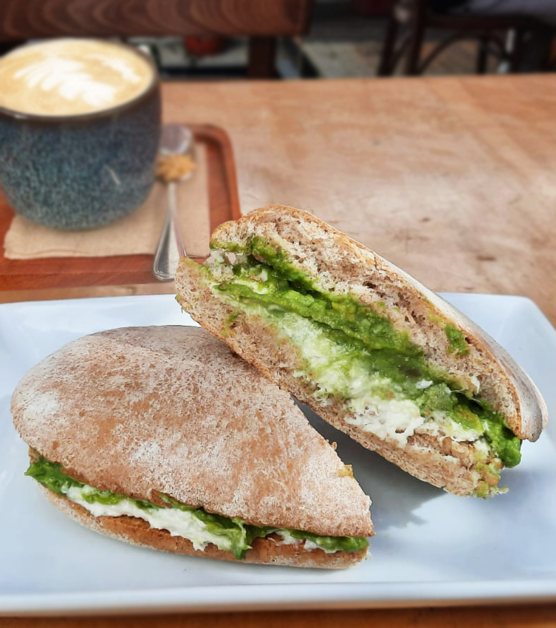 Panini con pollo, palta y mayo, acompañado de café o té a elección