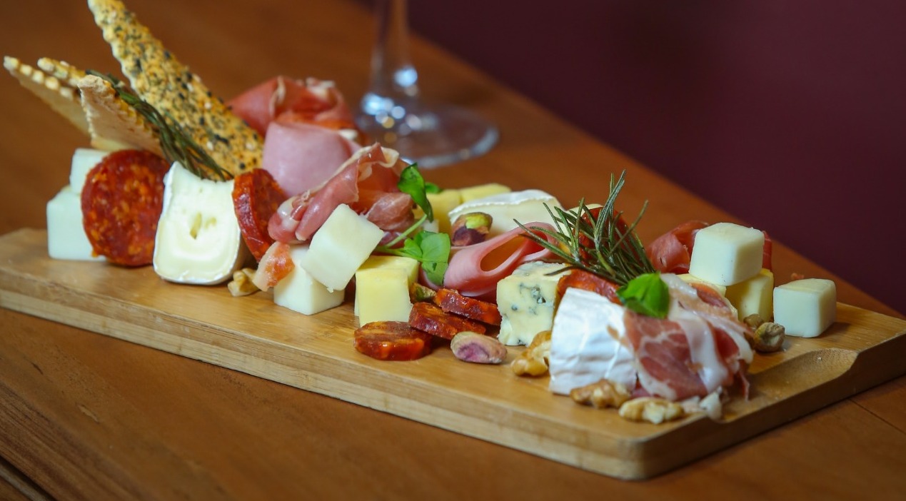 Lonjas de jamón serrano, alcachofas apanadas fritas, trocitos de queso de cabra, queso azul y de fundo, acompañados de frutos secos, aceitunas sevillanas y pimentón asado al ajo. / 13.900
